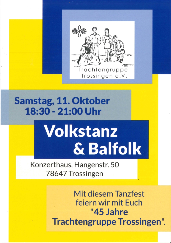 Zum 45-jährigen Bestehen der Trachtengruppe Trossingen vernastalten wir ein großes Tanzfest mit Volkstänzen und Balfolk. Klaus Fink wird in gewohnter Weise die